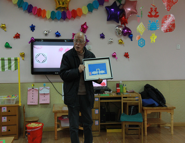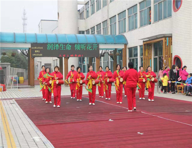 社区腰鼓队的奶奶们也热情地打起了腰鼓来!幼儿园里真热闹!