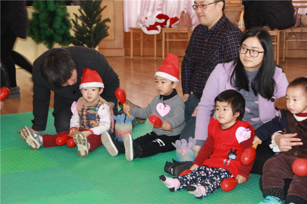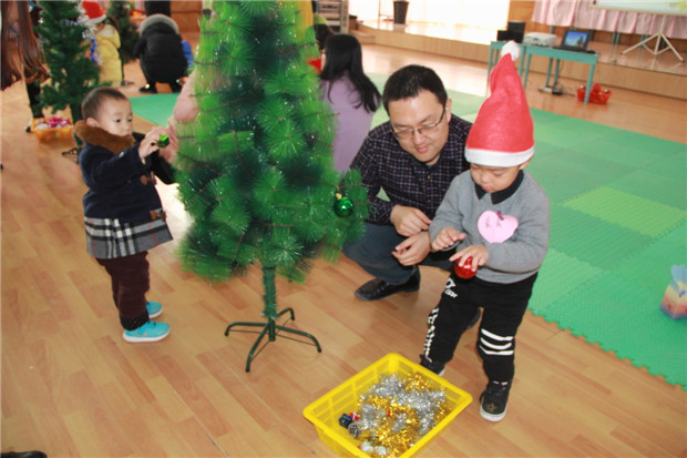 12月24日圣诞节前夕,为了让孩子们能够更好地感受圣诞节的氛围,龙贝贝早教园特开展了“快乐过圣诞”早教活动,让孩子在父母的陪伴下度过一个快乐的节日。 活动中,我们请来了“圣诞老人”为小朋友们送上礼物,小朋友们也热情地向圣诞老人进行了自我介绍,在这样欢乐的互动氛围中,一系列的亲子早教活动正式开始啦!首先,小朋友们认识了乐器——沙锤,并一起跟着音乐《铃儿响叮当》的节奏,用沙锤进行了一场欢乐的打击乐。接下来,小朋友们亲自动手装扮起了圣诞树,他们将可爱的装饰品逐一挂到了圣诞树上,小礼物、小雪花、小铃铛……在孩子们的装扮下,美丽的圣诞树出现在了大家的眼前。最后,大家一起围绕在圣诞树的周围,唱起歌儿跳起舞来庆祝平安夜,共同期待明天的圣诞节! 这次亲子早教活动,不仅使幼儿对西方文化有所了解,还让孩子们感受到了爸爸妈妈的亲子亲情,更让老师与家长之间更进一步的沟通与交流,促进幼儿健康快乐地成长!