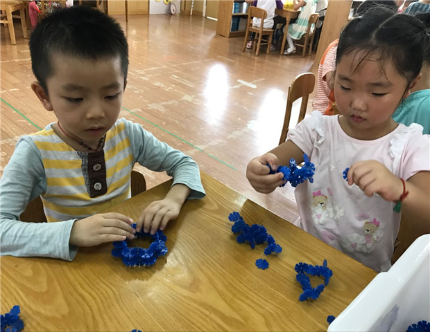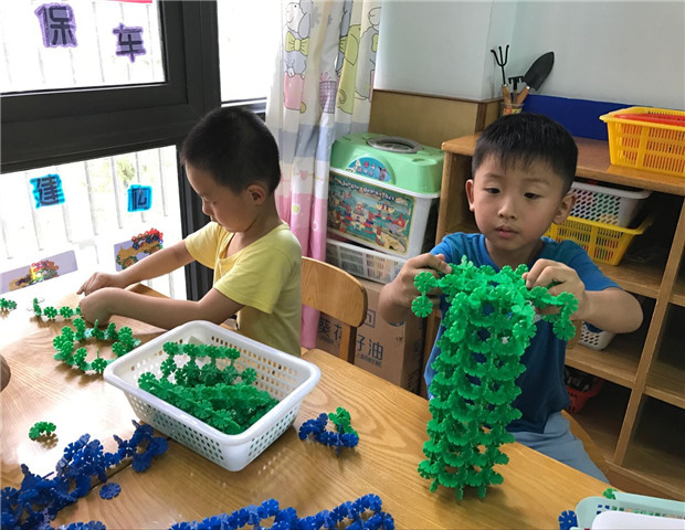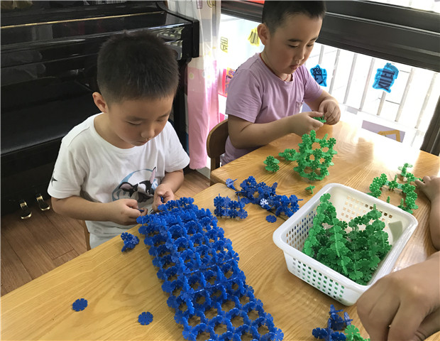 随着主题《中国娃》的开展,孩子们在多种形式的活动中,进一步感知祖国的地大物博,领略了祖国山河的秀丽和多彩的民族文化。为了培养幼儿的爱国情感,9月27日,龙虎塘中心幼儿园腾龙园区大班的小朋友们开展了“快乐建构,喜迎国庆”主题系列活动,以此来庆祝祖国妈妈的生日,表达自己对中华民族的热爱。 孩子们首先欣赏了天安门、长城、人民大会堂等图片,观察其外形特征,在观察时,很多幼儿都激动地说:“我去过天安门,看过解放军叔叔在升旗呢!”还有很多幼儿在感叹长城可真长!观看图片后,孩子们都迫不及待想要动手拼一拼这些宏伟的建筑了。在拼搭过程中,孩子们自己找到自己的小伙伴,相互分工合作,有的在搭建屋顶,有的在拼搭花圃,还有的在拼搭长城……孩子们都沉浸其中,感受着祖国的宏伟壮丽! 快乐的建构游戏让孩子们玩出了花样、玩出了快乐、玩出了创造,进一步让幼儿了解祖国,热爱祖国,为自己是一个中国人而感到骄傲。孩子们用自己的小手,表达了对伟大祖国的热爱和祝福,祝愿祖国妈妈明天更加辉煌、更加美好!