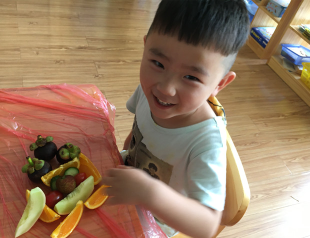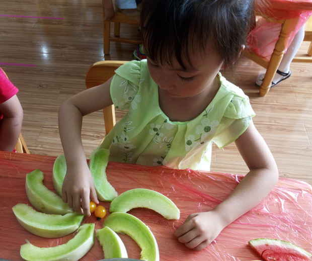 水果是幼儿极其喜欢的食物,于是,星星2班和星星7班开展了“水果大拼盘”主题性游戏活动。活动前,师幼一起准备了各种各样的水果,一次性手套、餐盘等。活动时,孩子根据自己喜欢的水果拼盘样式,参照图片,选择水果进行自主创意。瞧,这是我拼的房子;看,我的拼盘里用了5种水果呢;快来看啊,他的拼盘可真漂亮……孩子们在分享、合作、交流中体验了夏季的别样乐趣。