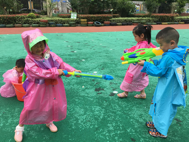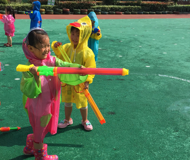 六月的天气是炎热的,六月的太阳是火辣辣的,炎下酷暑下,水中嬉戏自是清凉解暑的最佳方式。于是,星星5班、星星6班、星星8班的师幼开展了“水仗PK赛”活动。活动前,教师早早通知家长们给孩子准备好了水枪和雨衣。活动当天,孩子们分成红黄两队,每位教师参与一队,每位幼儿在胸前贴上自己队伍的标记,水枪PK赛就正式开始啦!瞧,孩子们穿着雨衣,手持水枪,不管你是谁,加满水就往你身上射。孩子们玩得不亦乐乎,欢笑声、打闹声洋溢在整个幼儿园。