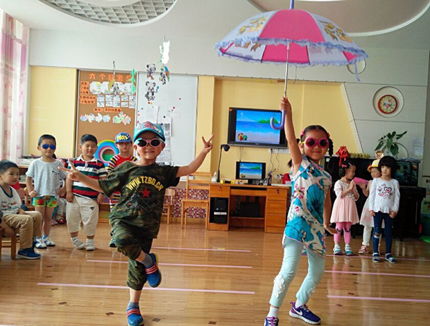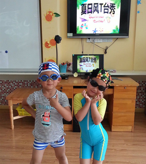 炎炎夏日,怎能少了墨镜、太阳帽、泳衣、游泳圈……星星1班、星星3班、星星4班的小朋友们穿上夏日的泳装、戴上漂亮的太阳帽、太阳镜,撑起遮阳的小花伞,立刻转型成为了小小的模特演员,开展了一场“夏日风T台秀”活动。教室就是孩子们的T形舞台,跟随着欢快的音乐节拍,小模特们分组出场。他们踏着节奏,大胆地向大家展示自己的夏日装扮,或耍帅扮靓,或清凉休闲。看着孩子们脸上洋溢出的笑容和自行坚定的步伐,在场老师和小观众们欢呼与喝彩不断。
