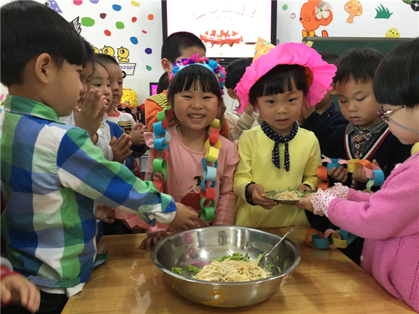 过生日,对于孩子们来说是一件非常快乐的事情,他们可以尽情地享受美味的蛋糕,接受来自长辈的祝福与生日礼物。为了让幼儿能够更好地了解生日的意义,以及过生日可以做的事情,龙虎塘中心幼儿园盘龙园区小班年级组在五月的头两周,就开展了以《过生日咯》为主题的形式多样的主题性游戏。 家长来助教,蛋糕现场做 5月3日上午,我们邀请了星星2班田若辰妈妈来园进行家长助教活动,向孩子们展示了蛋糕的制作过程。早晨,田妈妈早早地就准备好了蛋糕胚子、淡奶油、模具等需要用到的材料。过程中,她一边讲解,一边进行蛋糕制作,并应孩子们的要求,还现场在蛋糕上绘制了一个可爱的HELLO KITTY,同时在凯蒂猫的边上放了几朵粉色和紫色的玫瑰。蛋糕的香气伴着诱人的奶油,孩子们一边欣赏着,一边口水都忍不住流下来。有的孩子时不时为田妈妈制作的精美蛋糕送上自己最真诚的赞叹声和掌声;还有的孩子,看着美味诱人的蛋糕,现场唱起了生日歌。 通过这次家长助教活动,孩子们对蛋糕的制作有了更深入的了解,也更明白生日的美好。同时,孩子们也惊喜地发现了,原来,我们身边的妈妈们也是非常好的老师,可以教会我们许多。 创意无极限,蛋糕DIY 星星2班的孩子们在欣赏了田妈妈制作的蛋糕后,也心里痒痒,想要自己尝试进行蛋糕DIY。这不,大家已经忙活开了。有的用蜡笔装饰蛋糕,有的用压花器压出的小花来装扮蛋糕,还有的用沥糊材料,像糕点师傅一样,在蛋糕上涂上“奶油”,装扮出漂亮的爱心、笑脸、小花等等。活动中,孩子们一边用心DIY,一边还时不时地想着怎样进行过生日的游戏。瞧,有的孩子就以小组为单位,直接在过家家,过生日了呢! 孩子们说,虽然我们不会制作真的蛋糕,不过,我们也体验了一把蛋糕师的感觉。我们可以用我们自己的小手,制作出与众不同的蛋糕,等长大了,也要像田妈妈一样,制作真正的蛋糕! 快乐生日会,品味长寿面 过生日还可以干什么呢?孩子们说:“老师,过生日可以开生日会,可以收礼物,还要吃面条的!”是呀,过生日对小朋友来说是值得期待的,而每月,我们也会为当月生日的孩子过集体生日,让孩子们体会到在幼儿园里过集体生日的快乐,同时也能增进孩子们之间的友谊。平时的生日,我们都是以蛋糕为主题,唱歌送祝福,却很少送礼物。 而这次的生日却有点特别哦!星星1班的主题性游戏中,孩子们各自做着自己的礼物,有的做花环、有的做生日帽,还不忘给过生日的小朋友戴上。做好了这些礼物,他们开始和老师一起忙着做长寿面,细细长长的面条,在孩子们的巧手之下,变成了美味的凉面。放点佐料、用小手拌一拌,香味扑鼻而来,孩子们一边做着,一边忍不住在咽口水。孩子们在活动中感受到了送礼物和收礼物的快乐,体验了别样的美好生日! 相信未来,对于生日,孩子们一定会有着更深的了解,同时懂得为他人送上祝福,懂得爱和感受被爱的幸福! |