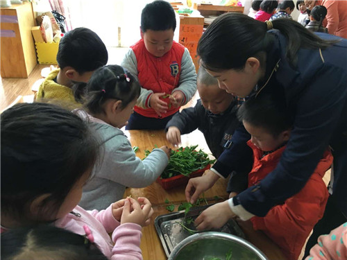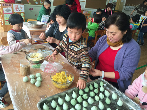 经过奶奶们的讲解和指导,孩子们学会了简单的制作方法。做青团需要取少许面团,用两只小手慢慢地搓圆,再在掌心压成小饼,包入馅料,不能露在外面,最后把面团搓成小球状。拌马兰需要经过拣菜、洗菜、切菜,在奶奶的指导下,孩子们都变得那么熟练,大家忙得不亦乐乎。马兰制作好后,便是要调制佐料了,在老师和奶奶们的指导下,孩子们尝试放入适量的调料,教室里立刻香气扑鼻。