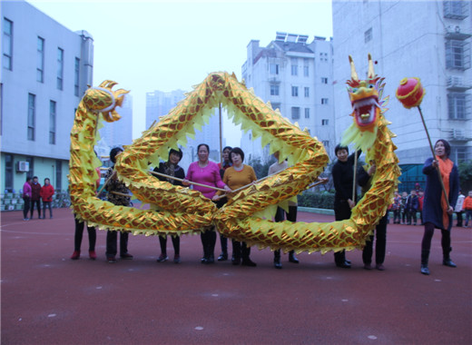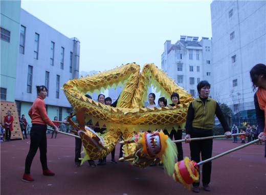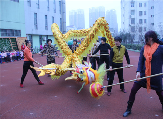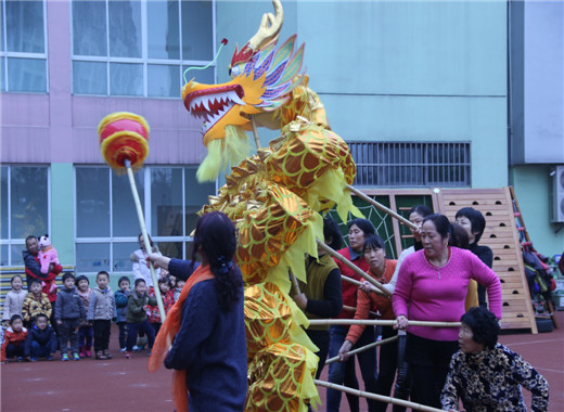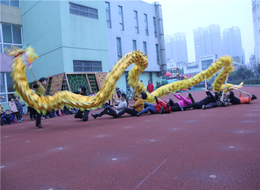 春节舞龙,作为传统喜庆项目,一直以来广受人们喜爱。伴随着主题《快乐运动,快乐新年》的热闹开展,为了让孩子们进一步了解新年的习俗,感受新年的欢乐气氛,我们充分收集和发掘了部分家长中的人力资源参与学校课程中来。12月28日,龙幼腾龙园区大班年级组特别邀请了刘浩宇小朋友的奶奶和她的腾龙社区女子舞龙队来园,为幼儿带来精彩的舞龙表演,让孩子们提前感受新年快乐的气息。 瞧,舞龙队带来一条精美威武的巨龙,在十一位奶奶的鼎力配合之下,和着铿锵的鼓点,盘旋在腾龙幼儿园操场的上空。只见巨龙忽而一字排开,忽而盘旋直上,忽而喷云吐须,忽而绕成一个大圆……这些精彩的画面孩子们以前只有在电视里才看得到,而今天,孩子不停地欢呼,不停地拍着小手,为奶奶们鼓掌加油。