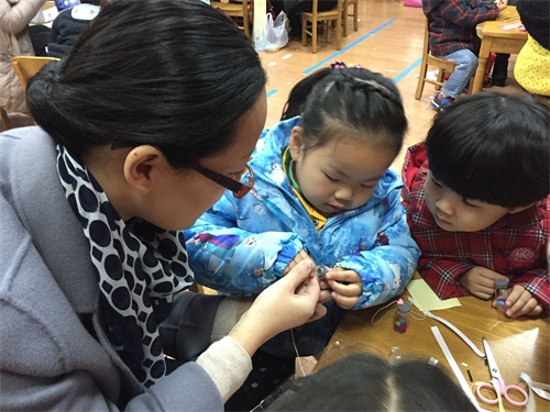 随着主题《玩具大家玩》的不断开展,孩子们对玩具产生越来越多的兴趣。为了让孩子感受到玩具带来的快乐,更加喜爱玩具,2015年11月25日至26日,龙幼腾龙园区小班年级组分别开展了不同的主题性游戏,让主题达到高潮。 家长助教:玩具制作DIY 孩子们来到幼儿园之后,玩到过许多不同的玩具:各种桌面玩具、区域游戏中的玩具……有没有什么不一样的玩具呢?为了满足孩子们的需要,星星1班邀请了部分家长代表来园,利用各种废旧物品和宝宝们一起亲手制作玩具。瞧,自制的玩具品种还真多:有纸盒易拉罐做成的坦克、装甲车;有串珠做成的漂亮风铃;有吸管纸盒做成的弹珠闯迷宫;甚至还有饮料瓶做成的直升飞机……孩子们和家长一起不光在制作过程中快乐开心,之后玩自己亲手制作的玩具时更加激动忘情。家长们在这次活动中也不断发现宝宝们的成长变化。 共同游戏:玩具大家玩 除了可以自己制作玩具,很多宝宝们都已经学会了分享与简单合作。瞧,有的小朋友将自己的玩具带来和同伴一起玩;有的小伙伴一起合作,尝试拼搭、垒高;还有的小朋友开始用不同方式来和颜料一起做游戏……大家一起玩玩具,每个人都分享自己的最爱给别人,在与人交往的过程中,体验到一同玩玩具的美妙。 你我同乐:玩具旅行记 如果某个小朋友带来的玩具大家都喜欢,那该怎么办呢?小朋友们想到了自己的办法:让玩具去旅行。于是,孩子们带来的玩具一件件地出去“旅行”啦:有的玩具比较多,那么就会旅行到某一个小组中去,这组的宝宝空闲时间就会一起玩;有的玩具只有一个,那么就可以去某一个宝宝家去“旅行”,第二天这个宝宝还会和大家介绍自己在家是如何和玩具玩游戏的。就这样,玩具们也开始了一场奇妙之旅,小朋友们也走在了与玩具游戏的路上。快乐,有时候就这样简单。 对于小班的宝宝来说,玩具就是他们最好的朋友。与玩具同行,让快乐相伴,相信孩子们的童年会幸福的像花儿一样。 |