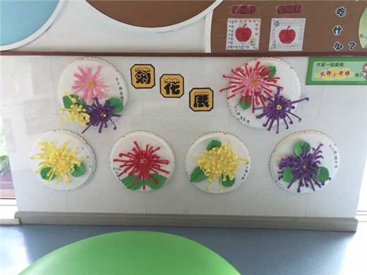 九月九,也是菊花节,菊花在这个季节里争相斗艳。月亮3班的孩子们在这个特殊的日子里,开展了“菊花朵朵开”乐享节日课程活动。活动前,孩子们了解到了解到菊花是五颜六色的。活动中,孩子们运用棉签、纸杯、彩纸等丰富的美工材料制作菊花。在整个制作过程中,每个孩子都用自己喜欢的方式制作了一朵菊花,充分发挥了想象力。为了把美丽的菊花留住,月亮3班还把制作好的菊花放在了幼儿园的大厅里进行展示,使我们的幼儿园到处都有重阳节的气息。