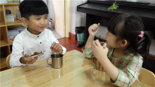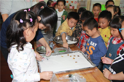 每年农历九月初九的重阳佳节,正是一年的金秋时节。在中国的传统习俗中,重阳佳节有登高、赏菊、喝菊花酒、吃重阳糕、插茱萸等活动。为了让孩子们感受到重阳节的气氛,2015年10月21日上午,龙虎塘中心幼儿园盘龙园区大班的孩子们一起来制作了重阳糕。 为了充分利用家长资源,我们还邀请了会做重阳糕的家长来帮忙。一大早,大家就忙碌起来了:准备糯米粉、大米粉、红丝绿丝、蜜枣等各种材料。材料准备好了,可是该怎么做呢?别急,让我们来看看来助教的妈妈、奶奶们是怎么做的。你瞧!妈妈、奶奶们先在容器里铺上面粉,然后将面粉调匀,放些芝麻、葡萄干、红绿丝等,重阳糕就做好了。紧接着,孩子们就在妈妈、奶奶的指导下,开始学着一起动手来做一做。只见小朋友们一会搓一会揉,一会包一会压,做好后还用红丝绿丝、蜜枣装饰重阳糕,真的很厉害哦!不一会儿,食料充足的重阳糕就做好了。 下午,在食堂叔叔阿姨的帮助下,孩子们吃上了自己亲手做的重阳糕。吃着美味的重阳糕,孩子们还不忘平日里照顾自己的爷爷奶奶和外公外婆,都想把自己做的美食让他们也一起来品尝。于是,我们将重阳糕包起来,下午放学送给来接孩子的爷爷奶奶们,让他们感受到孩子们浓浓的爱意。 本次活动,不仅仅是让孩子们学做一块重阳糕,更是希望在他们幼小的心中埋下爱的种子,懂得要关爱身边的每一位老人,从小学会感恩,体验生活的喜悦。同时,活动也让老人们乐享重阳佳节,感受到被关怀的快乐,为自己孩子的成长与进步感到欣慰与骄傲! |