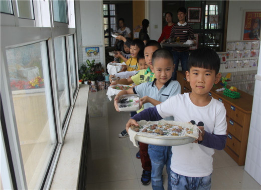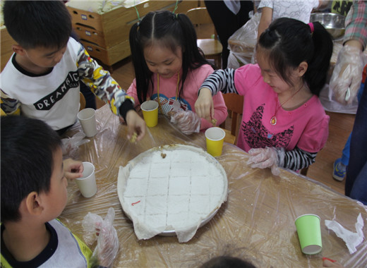 农历九月初九是我国的重阳节,又叫“老人节”。尊老、敬老是中华民族的传统美德,龙虎塘中心幼儿园腾龙园区大班年级组的师生们结合传统节日,开展了关于“尊老、敬老”为主题的活动。孩子们通过了解重阳节的来历,欣赏有关重阳节美妙的传说故事,和妈妈们一起亲手制作重阳糕,用自己的方式表达对爷爷、奶奶等老人的关心。现在我们就来看看亲子制作重阳糕的过程吧! 材料准备篇 活动前,老师和食堂里的工作人员已经准备好了糯米粉、米粉、蜜枣、芝麻、核桃仁、瓜子仁、葡萄干、红绿丝、白糖等丰富的原材料。有的孩子们从家里带来了许多的保鲜盒,准备装重阳糕用;有的孩子还带来了蒸锅和蒸笼,准备用来蒸重阳糕……大家根据自己的兴趣分工合作,把每种材料都分好了放到保鲜盒里,确保每一组的孩子都有材料用到。在这过程中,孩子们兴致勃勃地扮演着“小厨师”的角色,忙得不亦乐乎。 精心制作篇 此次活动我们还特别邀请了9位家长代表们来园和孩子们一起制作重阳糕。上午9点,活动准时开始了。看,妈妈们都是制作重阳糕的高手,她们首先把梗米粉和糯米粉加微量的水和在一起,别看简单,但是在筛米粉的时候,可是花了很长的功夫,可见妈妈们做事情的精益求精。当孩子们看着妈妈熟练地揉面粉时,都跃跃欲试。于是,孩子们亲自上阵啦!他们在保鲜盒下面放好了纱布,刷了层油,然后把粉一层一层地铺在保鲜盒和蒸笼里面,接下来就用的各种果仁进行装饰,,不一会儿,一块块漂亮而富有创意的重阳糕就呈现在我们的眼前了。有爱心形的、有小动物形的、有几何图形的、有娃娃形的、有花形的……制作的重阳糕形状各异,妙趣横生,孩子们不禁快乐地欢呼起来:“我们做的重阳糕真好看啊!” 美味分享篇 下午,在食堂师傅的帮助下,小朋友们吃上了自己做的重阳糕,大家一边吃一边说:“真好吃”、“真甜”。 放学的时候,爷爷奶奶来接孩子了。孩子们在大厅里把亲手制作好的重阳糕送给爷爷奶奶等长辈们吃。“爷爷,爷爷,来吃重阳糕,祝你笑口常开,身体健康。”“谢谢你,孩子们,你们真棒!”当孩子们把亲手制作的重阳糕喂到老人嘴里时,一份甜蜜从爷爷奶奶的嘴里直达心里。因为,孩子幼小心灵中的那份浓浓爱意早已溶于糕点中,用自己所独有的方式表达着对爷爷奶奶的关心、爱护和尊敬。