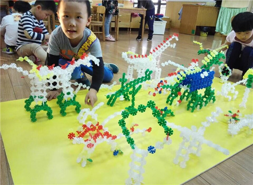 腾龙太阳1班开展了“雪花片建构恐龙园”比赛活动。在进行简单分组后,孩子们利用单元积木、辅助材料等开始快乐建构。小手翻腾间,栩栩如生的“霸王龙”、“三角龙”、“翼龙”等跃然而出。游戏中,老师们不仅感受到孩子们建构时的愉悦,也从孩子的角度体会到建构游戏不仅仅是简单的堆砌拼搭,它需要思维的拓展,想象力的延伸,协商的合作……最后,老师们提出:保留建构现场,以便让更多的孩子们感受建构的神奇。 快乐的建构游戏让孩子们玩出了花样、玩出了快乐、玩出了创造,相信他们会对常州的地标建筑——恐龙园,更加地了解与喜爱。