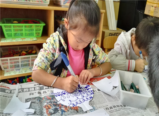 蓝印花、印染、剪纸、绘制脸谱……一系列的民间工艺活动中蕴含着大量的中国传统元素。太阳3班的孩子们在玩与做的过程中,既发展了动手能力,又感受到民间技艺中的文化气息。在一片以幼儿作品为装饰的环境中,我们欣赏到的不仅仅是美,还有孩子们对传统技艺的传承与发扬。 蕴含着地域文化、中国传统文化的游戏,除了给孩子们带来快乐,更能让孩子们较早较好地接触到这些文化。从而为生在中国而骄傲。 在游戏中发现,在文化中成长,让我们用游戏带着孩子们一起,歌颂生活、歌颂祖国。 |
