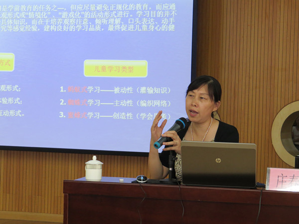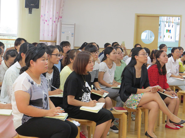 随着我园课程游戏化的不断推进,儿童立场、趣味化、年龄特征等关键词已经渗透到幼儿一日生活的方方面面,需要老师们的细心揣摩,更少不了专家们的专业指引。 9月21日下午 园本培训时间,龙幼有幸邀请到常州市教研室、幼教专 家庄春梅 老师来园,为全体教师开展了题为“课程化游戏化班级环境创设的意蕴”专题讲座,以便更好地推动了我园的课程游戏化进程! 本次讲座中,庄老师结合《纲要》、《指南》中的理论,通过课堂实践和自己的研究,利用丰富的图片资源、经典的案例,为教师们讲述了在幼儿园主题课程背景下,如何创设可以最大限度的让幼儿直接感知、实际操作和亲身体验的班级环境和区域活动。从幼儿的学习特点看环境创设、环境创设的要义、班级环境创设的原则、主题课程化环境创设的体现、班级环境的整体评价……不同的角度、不同的切入点,庄老师风趣地运用形象化的语言为老师们详细解读了幼儿园班级环境创设的意蕴所在。 一个多小时的趣味讲座,充满了实用性和趣味性,让在场的老师眼界大开,也不断点拨着每位教师的心弦。原来孩子们的学习之旅在探索的同时也是一场心得旅程。相信龙幼的老师们在这样的指引下,一定会掀起课程游戏化的一个个高潮,使班级环境更加有心、有意、有序、有趣,让孩子们的游戏更加自由自主,乐智乐心!