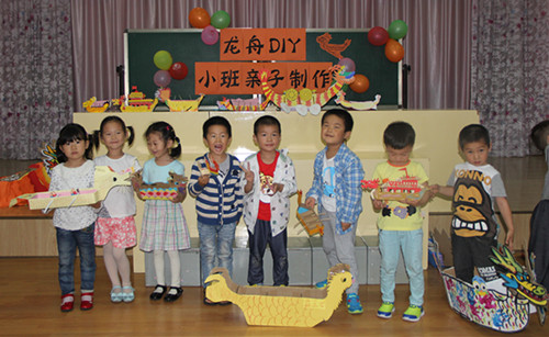 6月16日下午,爸爸妈妈们带着自制的半成品龙舟来到了三园区的音体室,开展了亲子制作活动——龙舟DIY。前期,老师们将搜集的相关自制龙舟的图片利用博客的形式呈现,给予家长参考和指导。当音乐响起时,家长和宝贝们信心十足地动手干了起来。有的在拼搭好的木龙舟上涂上色彩斑斓的颜色,有的用废弃的硬板纸拼接成了龙舟,有的用彩纸剪成半圆变成龙鳞……可谓是创意无穷。最后孩子们在劲爆的旋律中向大家一一展示自己的作品。活动结束后,我们还借用自制的龙舟开展了音乐游戏——赛龙舟。在锣鼓震天的响声中,孩子们你追我赶,真正体验了端午浓烈的节日氛围。