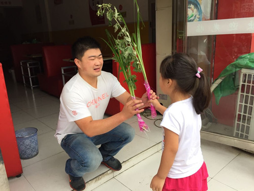 民谚说:“清明插柳,端午插艾”。端午节也有采集艾草挂在门楣和窗户上的习俗,取其辟邪的寓意。小班年级组的老师事先到菜场买来艾草。孩子们先将其洗干净,然后尝试自己用红绸带进行包装。6月19日上午,带着浓浓祝福的艾草,孩子们兵分两路,走进了园区的其它班级,走进了社区,用微笑送出了端午佳节的美好祝福。