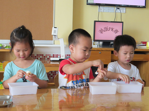 民间相传吃蛋生心,为了图吉利,吃蛋也成了端午节的重大习俗。6月19日下午,小班年级组开展了剥蛋比赛。在老师的周密准备下,比赛紧张而有序地进行着。随着开始的口令,剥蛋的小朋友迅速地敲碎蛋壳剥了起来,只见一片片蛋壳从蛋上滑落下来。剥蛋的小朋友全神贯注,不一会儿,白白的蛋就出现了。只见他们举起小手大声地说:“老师,我好了。”看着第一个剥好的小朋友,其他比赛的选手们就更起劲了,场面异常热烈。活动在增强幼儿手部能力的同时,也体验到了劳动的快乐。