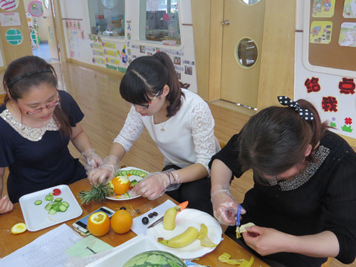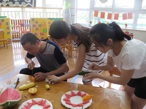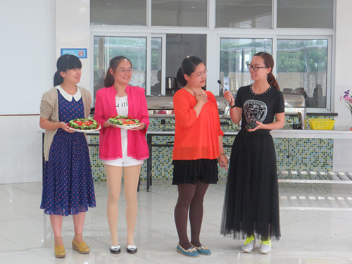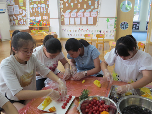 缤纷夏日、田园新绿、致青春、甜蜜时光……当看到这些词,你会联想到什么呢?而当这些优美又富有寓意的词,跟一盘盘创意十足、充满视觉美感的水果拼盘联系在一起的时候,你是否会感到惊喜呢?5月25日下午,龙虎塘中心幼儿园团支部组织全体教职工齐聚玲珑园区,开展了一次别开生面的水果拼盘大赛。 下午16时30分,在主持人介绍完比赛要求和规则后,教师们便热火朝天地忙碌起来。每个年级组的老师分工明确,有的准备水果、擦拭工器具,也有的积极动脑、构思作品,虽然不是专业厨师,个个却信心满满,可以说是铆足了劲。材料虽然简单,老师们的手艺却毫不含糊。在大家无限的创意和精细的刀工下,西瓜、香蕉、葡萄、黄瓜、番茄、圣女果、芒果、橙子、菠萝、草莓等各式水果,被改造成片、丁、丝、块等各种形状,拼放成各种图案,真是五彩缤纷,精彩纷呈。 一阵阵欢声笑语之后,一盘盘形态各异的水果拼盘就“新鲜出炉”了。“两小无猜青梅竹马”、“海陆空三军仪仗队”、“两个吃货的故事”……各式主题的水果拼盘无论从构思到造型设计再到现场展示解说,都别出心裁,令人眼前一亮。它们不仅名字动听,色形俱全,而且内涵丰富、寓意深刻。经过一番讨论,评委们分别从“深扣主题”、“色彩搭配”、“讲解特色”、“现场整理”等四个方面分别进行了打分和点评。 本次比赛展现了教师们对创新生活的热情,也展现了大家活跃的思维以及创造能力。希望通过这样的活动让更多的教师意识到创新的重要性,在今后的学习、生活和工作中不断追求、不断创新,创造更加精彩的“拼盘人生”。 |