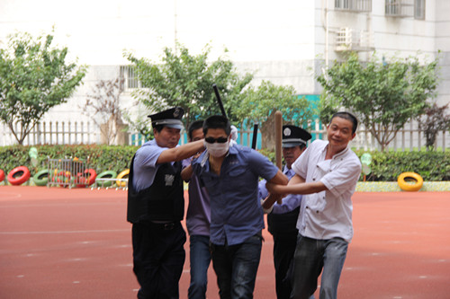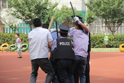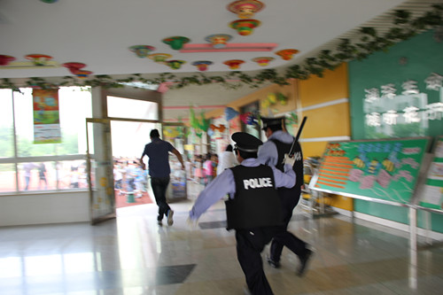 安全是幼儿园的第一要务,为了落实上级主管部门安全教育精神,坚持“预防为主、综合整治、安全第一”的原则,加强员工防暴力的意识和能力,保障园所正常的秩序和师生的生命安全,积极应对暴力事件频繁发生的形势,做到防患于未然,2014年5月28日上午,龙虎塘中心幼儿园腾龙园区开展了全体师生防暴力应急演练活动。 本次活动邀请了教师家属配合扮演暴力分子。 上午8点40分左右,各班老师带着孩子们在操场进行户外活动时,一名戴墨镜的陌生男子尾随家长闯入幼儿园,被门卫发现并加以盘问。那名男子眼看行迹败露,立即跑向操场幼儿活动区,企图劫持幼儿,保健老师及时拉响警报,各班教师迅速带幼儿撤离到班级,并把门锁好。学校男教职工手持木棒铁棍等冲出来,与保安人员一起与“歹徒”搏斗并很快制服了他。整个演练历时2分23秒,充分体现了全园教职员工的凝聚力和向心力,使大家懂得了团结才有力量! 短短的演习,给孩子们留下了深刻的印象,使孩子们懂得了在突发事件中如何听从老师指挥,有效保护自己,从而增强了孩子的自救意识。孩子的安全不仅关系到每个家庭的幸福与安宁,也关系到社会的稳定与和谐,只有我们提高认识,齐心协力,采取有效措施,才能构筑起保护孩子生命安全的防护门,才能创建安全和谐的校园! |