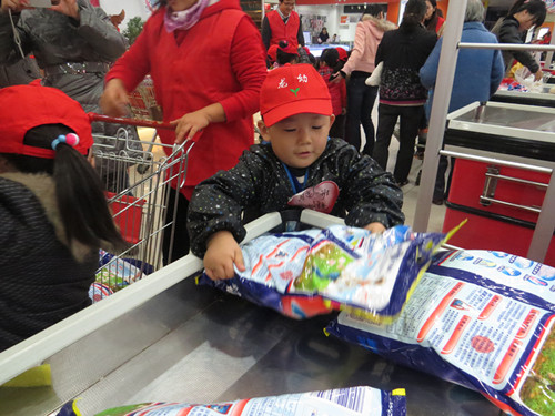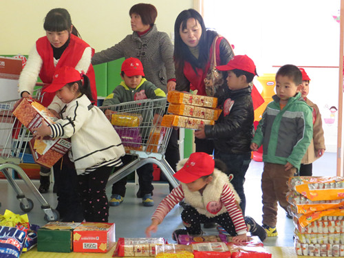 龙虎塘中心幼儿园第二届“大手牵小手、爱心满龙幼”义卖节在龙幼所有家长和幼儿的大力支持下,在 进入超市后,小朋友们按照计划兵分两路,分别选购冬季保暖用品和营养食品。孩子们根据自己的生活经验,很快找到了所需物品的摆放位置。个别幼儿还能够充分的利用自己的社交能力,在遇到困难时主动地和导购阿姨交流,咨询物品的详细情况。很快,购物篮里装满了蛋黄派、沙琪玛、老人手套、热水袋、坐垫等等……大家喜颜悦色,满载而归。那一袋袋沉甸甸的物品,包含了孩子们纯纯的爱,浓浓的情。活动后期,我们还将带着我们的爱心走进敬老院,福利院,和孩子们一起用爱心诠释希望,用行动播种阳光! 爱的呼唤,爱的奉献,爱的回声,一颗颗充满爱的心灵,结下了一串又一串美丽的硕果。有爱就有阳光,有爱就能实现心中的梦想。让我们与爱相随,让关爱成为我们的习惯,让我们的校园更加和谐美好!