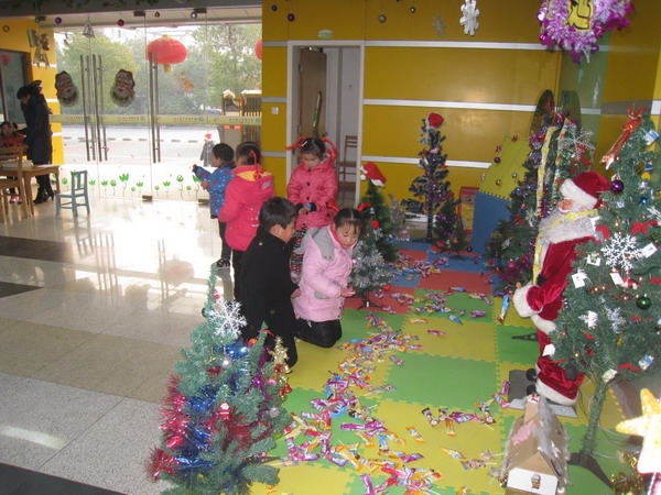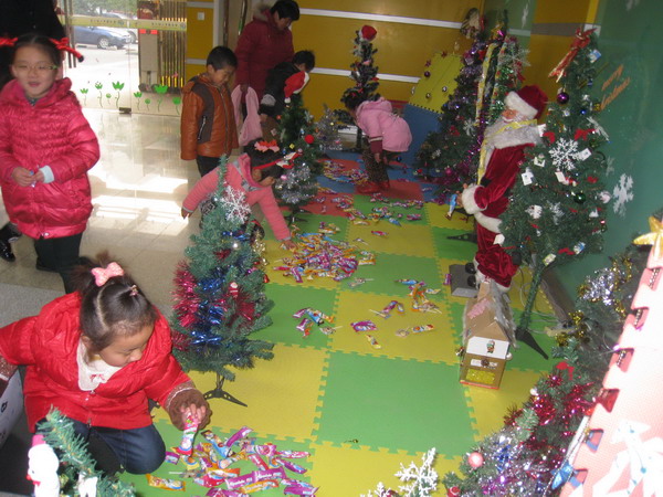 伴随着冬日里灿烂的阳光,2012年的圣诞节如约而至。12月25日,我们龙幼的孩子们也感受到了这浓厚的节日氛围。踏着温暖的阳光,孩子们来到了幼儿园,先是被大厅焕然一新的节日环境给震撼住了,一位身着红妆的圣诞老人伫立在圣诞树的中央,在圣诞树上的灯光照耀下显得格外慈祥、可亲。再瞧空中悬挂着的铃铛、雪花更是为这节日的气氛增添了光彩。