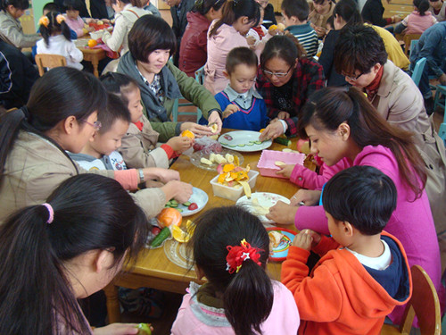 早上8点半,家长兴致勃勃地来到了幼儿园。首先各位家长观看了孩子的课堂表现,活动内容主要是语言活动《捉迷藏》、数学活动《印点子》、《谁排在最前面》等。活动前,每个教师准备充分,活动的每一个环节都做到了精心设计和认真组织,家长们对于孩子的表现也是看在眼里、乐在心里。接着,各班进行了不同的亲子活动:水果拼盘、亲子制作变废为宝、树叶粘贴画。家长们参与的积极性很高,都在家做了精心准备,给大家带来了一份意外的惊喜,将今天的开放日活动推向了高潮。活动过后,家长们对本次活动给予了充分的好评。