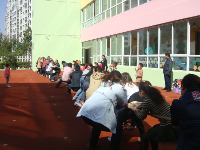 区域游戏和亲子制作活动中,有些幼儿能独立而又创意地完成积木拼搭;有些幼儿能够和大家一起分享合作带来的快乐;还有一些幼儿和家长们在互动中体验成长的快乐,家长在和孩子一起玩一玩的过程中也体验到了久违的童趣! 亲子活动:《水果拼盘》 亲子活动:《树叶拼贴画》 好玩的区域游戏 家长们的拔河比赛