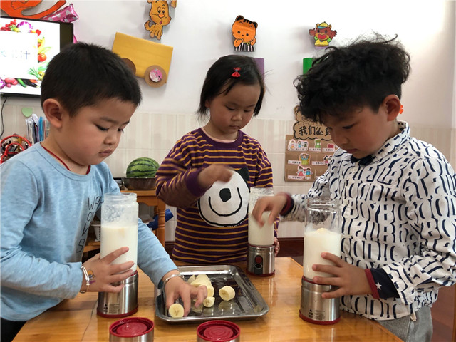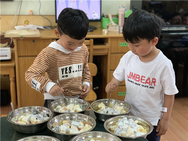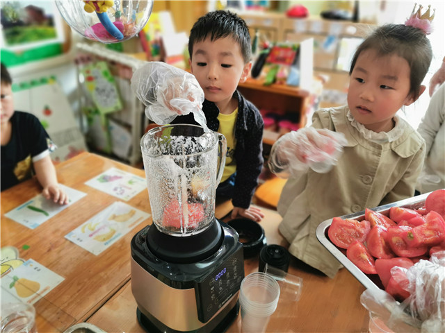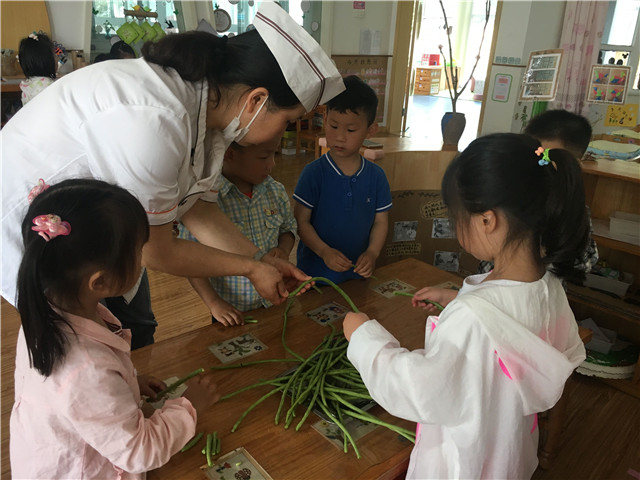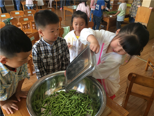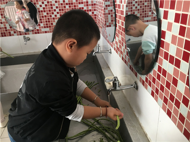 春夏之交,花开满园,蔬果集合,果香四溢。5月中旬,龙虎塘街道中心幼儿园三园区小班年级组从果蔬出发,探讨营养价值,开展了《蔬果舞会》主题性游戏,让幼儿在游戏中了解蔬果,爱上蔬果。 园家合作:主动参与,爱上与蔬果的游戏 小班幼儿在日常生活中经常出现挑食、偏食、不爱吃水果的现象,怎么办呢?为了促进幼儿更多地了解蔬果中所蕴含的营养价值,在家长的合作助推下,孩子们以蔬果为主题,开展了各种有趣的游戏。利用不同蔬菜水果的横切面进行拓印,一幅幅有创意的作品呈现在众人面前;利用仿真的蔬果,结合《指南》中关于健康领域的指导要点,进行了有趣的《蔬果藏在哪里》的体育游戏;与父母合作,利用身边的废旧材料制作蔬果服装,在有节奏的音乐中展现自己最喜爱的蔬果模样……每一次游戏孩子们都乐此不疲,每一次游戏后孩子们都对蔬果有了更多的认知。 动手探秘:亲身体验,寻找蔬果中的秘密 孩子们对于蔬果的兴趣愈发浓厚,慢慢地一个个疑问就产生了:葡萄的种子在哪里呢?校园里的梨花开了之后,会结出小梨子吗?每次妈妈给我榨的果汁是怎样榨出来的?……带着一个个问题,孩子们开始了自己的探究之旅。寻找教室内、校园里的蔬菜水果、参观哥哥姐姐的小菜园,甚至从家里带来了各种蔬菜水果,就是为了研究一下种子到底藏在哪里;将水果一个个地清洗干净,怎样才能拌出好吃的沙拉呢?是不是除了做沙拉,还能够榨果汁啊?孩子们通过自己的动手操作,一个个都满脸惊喜,与同伴、老师交流着自己的答案。每一个孩子都是一个小问号,解决问题的最好方式就是实际探究,在过程中体验解决问题的快乐。 走进生活:实际感知,体味做美食的乐趣 每天的午餐都是孩子们最快乐的时刻。但是这些蔬菜是怎样做成美味的菜肴呢?为了让孩子们了解菜肴的制作过程,在与厨房厨师的协调下,孩子们领取了小任务:为当天幼儿午餐中“清炒豇豆”这一菜肴,进行前期的洗菜、择菜工作。在食堂师傅的指导下,孩子们认真清洗豇豆,并根据示范,将豇豆折成适当的长短。同时,食堂师傅还给孩子们介绍了当日食谱中其他蔬菜的营养价值,加工制作方法等,让孩子们对于午餐有了更多的期待。在午饭时,孩子们品尝着自己的劳动成果都开心不已,一种自豪感油然而生。 营养饮食是幼儿成长的重要因素,确保幼儿不挑食、不偏食是我们的长期目标。通过游戏、实践等方式,孩子们对不同的蔬果产生了浓厚的兴趣,对其营养价值也了解颇多。愿每一个幼儿都能够健康成长,快乐每一天。
