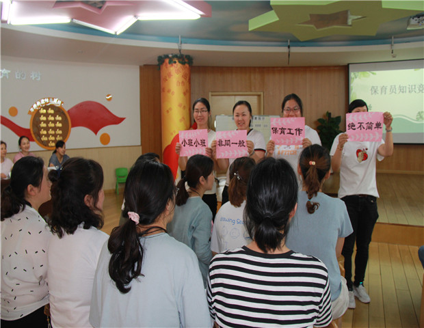 为切实加强幼儿园保育工作,提高保育员的整体业务素质,真正做到“保教结合,教养并重”,结合学期工作计划,6月17日下午,龙虎塘街道中心幼儿园开展了保育员业务知识竞赛。 全力以赴,积极备赛 本次竞赛分为三个环节:必答题、抢答题和简答题。竞赛题目包括卫生消毒、安全防护、疾病预防、卫生保健等各个方面。竞赛方案公布后,三园区保育员按级组分成小、中、大三个团队,自由选择出参赛代表,并商量制定了队名、口号。为了赛出风采,保育员们还充分利用空闲时间学习相关知识,认真做着赛前准备。 团队协作,赛出风采 在必答题比赛中,三个参赛组的保育员表现出色,她们结合自己的实践工作经验和定期开展的保育学习内容,仔细答题、认真思考,充分展现了扎实的保育功底。在抢答环节中,参赛保育员时而凝神思考,时而迅速抢答,时而激烈讨论,三队比分你追我赶,不分上下。最后的简答题比拼中,三组选手各尽其能、默契合作、认真商讨、自信答题,现场气氛紧张而愉悦。 现场点评,争创优质 最后,王彩红副主任对本次活动进行了现场点评,充分肯定了保育员在本次活动中的出色表现,并着重指出:开展本次活动的目的是为了给保育员提供一个互相学习交流的平台,希望通过丰富多彩的培训形式,促进大家学习钻研业务知识的积极主动性,使保育工作朝着更规范、更高质的方向发展,更好地为幼儿服务! 本次保育员知识竞赛的开展,不仅提高和巩固了保育后勤人员的业务理论知识水平,更培养了保育员在会做的同时敢于说、勇于说,真正做到知行言统一,最终力求规范,争创优质保育! 撰稿:潘雯雯 摄影:潘雯雯 审核:潘雯雯