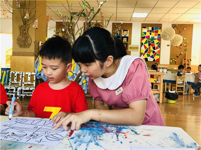 为庆祝祖国70华诞,龙虎塘街道中心幼儿园结合“乐享国庆”开展了“我和祖国共成长”系列活动。结合中班幼儿年龄特点,以绘出“祖国大好河山”为主题的幼儿绘画作品展开始啦!2019年9月的第三周,孩子们用稚嫩的笔触,创作出了儿童视角下的“祖国之美”。 组织形式丰富,让豪情溢满心中 祖国河山风光秀美,感慨之情跃然纸上。开学后,孩子们讨论的最多的就是暑假去各个美景城市游玩戏耍。从故宫到西湖,从博物馆到世界馆,从草原到群山,从恐龙园到青果巷......每一处都让孩子们兴奋不已。怀揣着对祖国的热爱,孩子们开始用画笔描绘他们眼中的美景:区域中,小小的纸张绘制出大大的风景;教室里,师生畅谈,言语中勾勒出对美景的喜爱,笔触中展现不同类型的景色;回到家,也与爸爸妈妈们一同用黏土捏出博物馆中的恐龙、设计港珠澳大桥……从古色古香的建筑到新时代的丰碑,满满的豪情萦绕心中。美丽的祖国就这样跃然纸上。 资源统整利用,丰课程生长内涵 我园教师队伍中艺术师资多元,如何更好地创造条件让孩子们看到美、认识美和创造美?中班年级组充分调动园区内有特长的教师资源,邀请这些教师走进中班的活动现场。擅长版画和油画的老师生动地演绎了不一样的美术表现手法,环创组的老师带来了丰富多元的美术材料,结合相关中国文化、名胜古迹等专题介绍,孩子们兴趣高涨,各个都饶有兴致地进行大胆创作......在资源统整的过程中,龙幼打开新的课程延展方式,让成长变得无限可能。 合理布置呈现,为祖国华诞献礼 一张张带着孩子们心意的作品呈现在了眼前。怎样让大家感受到这感人的一刻?各园区环创组教师邀请幼儿参与,一同布置,感受作品展出的喜悦。立体式摆放,让手工作品呈现出浓厚的传统文化韵味;阶梯式悬挂,让新中国的秀美逐级体现;网格式呈现,配合着极具内涵的书法作品,更是将祖国的大好河山呈现眼前。站在作品前,祖国大好河山尽收眼前、祖国浓情文化扑面而来,全园师生和家长不禁感慨:祖国,我为你骄傲!祖国,我为你自豪! 江山如此多娇!在祖国70岁生日到来之际,每个孩子用自己特有的方式,祝愿祖国不断成长,繁荣富强!而作为祖国希望的孩子们,将会植根祖国妈妈的怀抱,为祖国的繁荣昌盛茁壮成长! 撰稿:王志薇 摄影:三园区中班教师 审核:潘雯雯