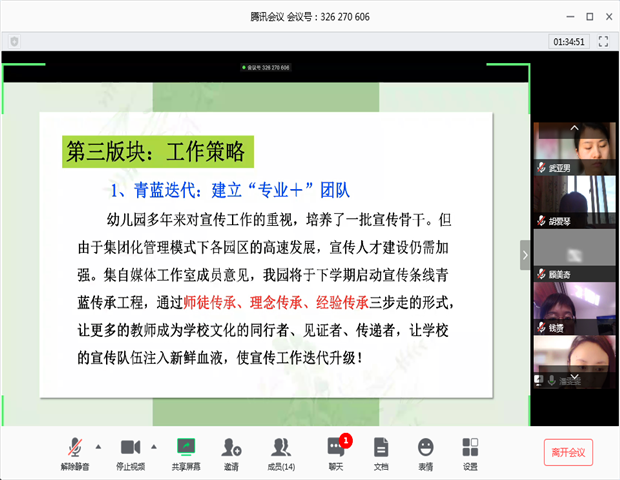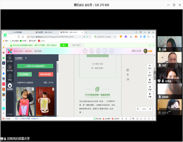 自新冠肺炎疫情发生以来,龙虎塘街道中心幼儿园自媒体工作室迅速扛起责任担当,每日编辑宅家课程,用心陪伴幼儿成长;专业书写战“疫”故事,传递龙幼积极能量。因为这次特殊的宅家工作经验,让我们意识到辐射技能提升团队战斗力的重要性。3月17日上午,自媒体工作室全体成员相聚“云端”,一起学习云技能。 在线教学,经验共享 本次活动由肖欢老师和微信公众号编辑小组成员在线上展开教学,以一则新闻为例,示范讲解利用“秀米”编辑器制作公众号的方法。首先,负责人先将编辑手册进行分享,让每位教师对活动有准备。随后,小组成员分解内容进一步在线讲述和操作,让每位教师对制作有思考。最后,针对观摩过程中大家遇到的困惑进行探讨,让每位老师对活动有收获。 集体实操,同生共长 实践是检验真理唯一的标准。会议中,每一位工作室成员都在电脑前进行了现场的实操练习。大家从风格排版的整体架构到图文卡片的精挑细选,从行文规范的整体布局到预览审核的有始有终,努力将知识运用实践,将经验化为行动。每一个宣传者都是不断成长的个体,在彼此相互的助力下,也可以实现同生共长的新样态。 智慧点评,总结提升 会议最后,潘雯雯副主任对自媒体工作室全体成员在抗”疫“期间的精诚合作表示了感谢,更充分肯定了公众号编辑团队随时在线的责任担当和毫无保留的技术指导。同时,她和全体成员分享了本学期工作室的计划,聚焦“融媒创新”提出三大策略:青蓝迭代:建立“专业+”团队;内容为王:坚持“精品+”导向;多链融合,打造“宣传+”矩阵,希望让更多的教师成为学校文化的同行者、见证者、传递者,推动宣传融合实现质变。 在这一次知识共享中,宅家不是问题,抗“疫”不是距离,相信我们在成长的共同体和学习的同心圆中,会让自媒体工作室进一步提高线上课程推送与防疫抗“疫”工作的宣传效益! 撰稿:颜梦迪 摄影:自媒体工作室成员 审核:潘雯雯