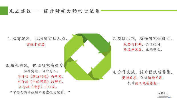 秉承“问题即课题”、“反思即研究”、“改进即成果”的教育科研理念,努力让课题研究促进集团的内涵提升,2020年4月16日中午,龙虎塘街道中心幼儿园特邀新北区教师发展中心薛辉校长参加我园第四次行政会议。会议采用线上模式,由全体行政、年级组长、课题组长主要参与,全体教师观摩聆听。本次会议力求激发教师的研究热情、提升研究能力,促进集团课题研究力的提升。 方案汇报,论证解读理思路 从我园《课题申报指南》出台到课题自主申报到方案撰写,我园共产生学校统领性课题1个,行政导引的课题2个,年级组课题9个,微型课题3个,共计15个课题。由内而外的研究自觉正是龙幼教育集团课题研究力提升的金钥匙。会议伊始,张静、顾科望、朱宏萍三位教师立足于园所统领性课题、行政导引的课题及年级组研究课题三个层面进行了课题方案的详细解读。随后,王惠副园长从“研究内源的迸发、灵动的组合、草根的追求”三个亮点进行了肯定,同时也提出了“提升研究力的四大法则”:心有疑思,找准研究切入点;质疑批判,增强研究说服力;植根实践,保证研究高效度;合作交流,提升团队新势能;要在实实在在的真行动中让研究走向深入、走向常态、走向持久。 专题讲座,深谈课题明方向 接着,薛辉校长的专家讲座既高屋建瓴又实用给力。首先,薛校长从标题到结构、从目标到内容等方面,对课题方案进行了现场论证、剖析修改,给予对策建议。同时,他为课题组进一步厘清了研究思路和研究范围,明确了研究目标和研究内容,为后期的研究指明了方向和路径。另外,薛校长围绕“做一个会研究的教师”这一专题,结合我园实际情况和研究聚焦点,从“研究是什么、课题的问题从哪来、如何做文献综述以及课题方案的逻辑结构”四个方面进行阐述,囊括了教师在课题研究中的基本问题,条分缕析地做出研究指导与疑难解析。专业、详细而接地气的讲座给老师们高位的引领和启发,高效助力教师的课题研究力。通过专家的点播和指导,我们的课题研究在原有的基础上也有了更多的突破。 总结提升,境界管理新高度 最后,高亚媛园长充分肯定了本次会议是学习场、能量场、对话场,以及现场满满的获得感。同时希望通过课题为载体的一系列研究,指向三类相遇下的境界:有境界的老师——宅家工作模式下自我能量的充值,创造龙幼教师独有的幸福而有意义的教育生活。有境界的管理者——把握教育规律,有区别于一线教师对人对事的大视野,大格局和大情怀,带领团队教师在变革中适应、突破、创生每一个新的节点。有境界的教育——要为孩子的生命成长打下底色,从而唤醒人的良知,带来内心的自由,进而真正触动人的精神成长。 龙幼人在真课题、真研究中建立课题攻关型学习团队,将研究与教学同步,理论与实践结合,促进教师研究的热情,激发专业成长的内核,提升教师职业幸福感。相信在课题研究共同体的抱团前行下,必将促成幼儿幸福成长、教师专业成熟,也让集团持续发展拥有了无限可能。 撰稿:陈梅 摄影:周媛 朱宏萍 蒋晶丹 审核:潘雯雯 |