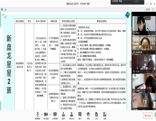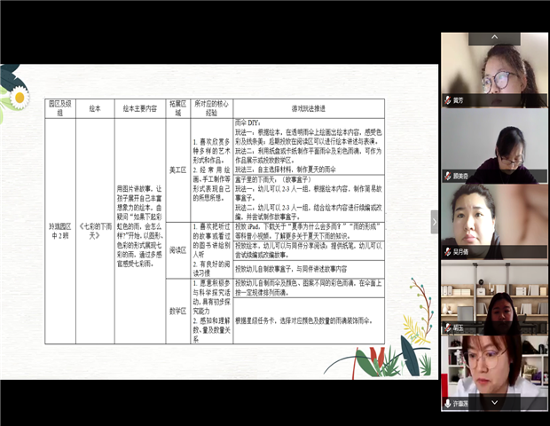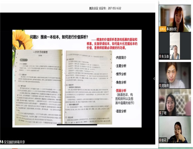 绘本以“图”为主,直观生动,贴近生活,所传递的信息符合幼儿的思维特点,能够激发幼儿的阅读兴趣。如何结合班级幼儿最喜欢的绘本,进行各个区域游戏拓展的深度研究,形成绘本下的班本化系列游戏打造方案?4月30日上午,龙虎塘街道中心幼儿园全体教师们通过网上“腾讯会议”,分级组开展了语言专题教研活动。 绘本调查,循幼儿兴趣 活动前期,各班教师以班级为单位,结合各级组近期主题——小班《蔬果舞会》、中班《热闹的夏天》、大班《准备上小学啦》,用适宜的方式调查了解本班幼儿近期的兴趣点,选择适宜的绘本,深入挖掘绘本的价值与线索,解读绘本内涵与教育元素,有效连接《指南》,生成适合本班幼儿发展的区域游戏,并梳理成稿。 教研互动,碰智慧火花 活动中,各班依据资源表展开分享,教师从幼儿兴趣点出发,以幼儿视角解读绘本,充分挖掘各区域活动中潜在的多元价值,勾连相关区域预设丰富多样的游戏。在此基础上,参会教师针对分享的绘本游戏提出自己的想法和建议,大家各抒己见,产生了许多思维碰撞。不同角度的思考和观念上的共鸣也在研讨中弥漫而开,相信在大家的智慧之下,绘本游戏将会让幼儿在多通道的感知与表达中获得最适宜的发展。 总结提升,促专业成长 最后,各级组蹲点教学行政对本次活动进行了专业的引领和提升。从“如何选择绘本”、“如何进行绘本价值探析”以及“如何提高幼儿自主阅读能力”这三方面,给了教师们切实可行的建议,为大家打开了新的思路和方向。 当绘本遇上游戏,当游戏融汇绘本,孩子们的潜能才能最大限度地发挥出来,通过此次教研活动,激发了教师们对绘本游戏拓展多角度、全方位的思考,有效促进了教师们的专业化成长及绘本游戏的深入开展。让我们巧用绘本,共学习、同成长。 撰稿:武亚男 摄影:各级组教师 审核:潘雯雯 |