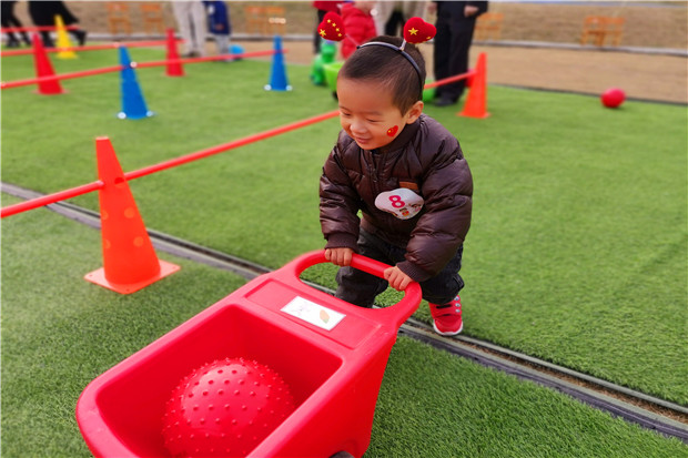 为了普及社区亲子教育,让早教观念渗透到每一个适龄儿童家庭,增进亲子间的情感交流,同时丰富社区业余文化生活,培养健康的生活方式,11月29日上午,由龙虎塘街道行政审批局主办,龙虎塘街道中心幼儿园承办的亲子早教运动会拉开帷幕。 营造温馨氛围,迎接宝贝来园 晨曦撒下的操场,皆是初冬的模样。龙虎塘中心幼儿园的男教师和早教组老师早早地来到盘龙新园区进行场地布置。温馨的拱门、飘扬的气球、精致的签到台,一切都准备就绪,迎接宝贝们的到来。不一会儿,宝贝们牵着爸爸妈妈的手,迈着稚嫩的步伐走进学校。面对新鲜的环境,宝贝们显得有些害羞,但在爸爸妈妈的鼓励声中,他们勇敢地打招呼,贴上脸贴,戴上头饰,跟随气球的指引走向今天的活动场。 运动游戏接力,促进亲子感情 伴随着国歌声,红旗冉冉升起。为更好地舒展身体,在周雁南、付帅和陆琰柯老师的带领下,爸爸妈妈和小朋友们进行了律动热身。接着,运动会开始啦!上半场分为四个活动:第一个项目是“小熊搬家”,利用小推车将小球进行运输,锻炼幼儿平衡能力。第二个项目是“拼垫过河”,作为亲子项目考验家长和孩子们的默契配合。第三个项目是“小马向前冲”,宝贝们骑上小马,驰骋“草原”,发展下肢力量。第四个项目是“拉滑板车”,大家坐上心爱的小车把握方向,爸爸妈妈助力前行共同冲向终点! 乐享趣味赛事,感受运动喜悦 经过中场休息,下半场的趣味赛更是精彩不断。障碍赛中,孩子们跨、钻、跳、爬,“翻山越岭”接力前行。爸爸妈妈或指导动作,或加油鼓劲。投球赛中,家长们化身袋鼠爸爸和袋鼠妈妈,接住宝贝们投来的爱的沙包。每看见一个沙包入袋,可爱的小脸上就会绽放出灿烂的笑容。最热火朝天的莫过于家长们的拔河赛了!宝贝们第一次看见爸爸妈妈团结一致,齐心协力地拼搏,感染之下清脆的加油声不绝于耳。 在全体教师的安全保障、精心策划和组织调整下,每一组家庭都获得丰富收获,整个活动欢笑不断,暖意浓浓!期待在未来的时间里,爸爸妈妈都能多一些时间陪伴孩子成长,多一些放手发现孩子闪光!
