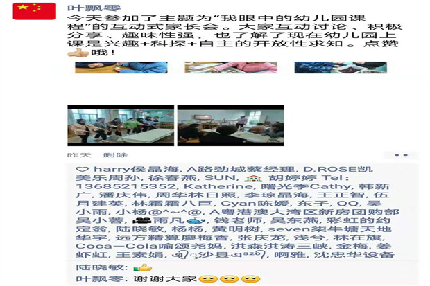 爸爸+妈妈+宝贝,是温暖的小家;老师+宝贝……是热闹的大家;小家+小家=大家。如何让老师助力“小家”,如何让父母支撑“大家”,让我们通过互动式家长会去互动、去体验、去感知,共同期待幼儿美好的未来!趣味海报,特色签到,怀着“家”的情怀,我们在春日的暖阳与微风中,相遇、相识、相知,彼此的心灵更加靠近。 一个“开怀”的游戏:遇见·一颗心 把我的心,你的心,串一串。串一株幸运草,让童年充满幸运色。一个简短、有趣的互动小游戏:顶锅盖、抢杯子、玩区域、打“鸡蛋”……瞬间拉近了大家的距离,因为有着同一个目标,我们默契携手,大胆互动交流。家长们通过观摩日常案例,结合刚需问题,分析解决策略,从而了解幼儿一日生活,了解学校课程生长,了解自理能力培养……每一个互动式家长会主题,都为温暖有力的“大家”奠定基础。 一场“有料”的讨论:打开·一扇窗 你们的“小家”,我们的“大家”,轻轻地打开窗门,遇见真好!妈妈诉说着教育困惑,爸爸透露着满眼欣慰,大家倾吐着甜甜希望。每一个孩子都是一颗种子,花开有期,却不尽相同。一个个育儿心得和疑难困惑,瞬间掀起一场场头脑风暴,在互动交流中,满满都是“金点子”。“你对幼儿在园有何担忧?你眼中的幼儿园班本课程是怎样的?当你观察到幼儿的行为时,你是如何发现并支持幼儿真实需求的呢?班级区域材料需要家长共同助力,你们有哪些好建议?如何培养幼儿规则意识?何为高质量的陪伴?”每一个家庭成员都是不同的个体存在,但我们在畅聊所忧所虑、所思所想中,逐渐收获共识,沟通中互生同感。 一个“共同”的梦想:播种·一个梦 苗儿有了滋养会生长,梦儿有了呵护会实现,我想,你想,我们想,每一个“金点子”铸梦成长,小梦共筑大梦,朋友圈、打卡表……承载每一位家长对宝贝们的期待!本次互动式家长会的开展,我们解决了实际园家工作中的很多薄弱问题,帮助家长树立正确的育儿观,配合班级工作,更能支持幼儿在参与课程中的体验性过程,从而以积极的态度与幼儿交流在园生活。但是我们也发现,本次家长会以女性居多,那么下一次的互动式家长会,爸爸、爷爷们,你们也想来为我们的成长加油助力吗?我们期待你们的到来哟! “小家”中的你们,是我们坚实的保护伞,“大家”中的我们,是你们的幸福源,从相遇到相知,互相协作,相辅相成,创建爱的家园,构筑梦的乐园,以此为起点,共进!让我们共同期待下一次互动式家长会的到来!