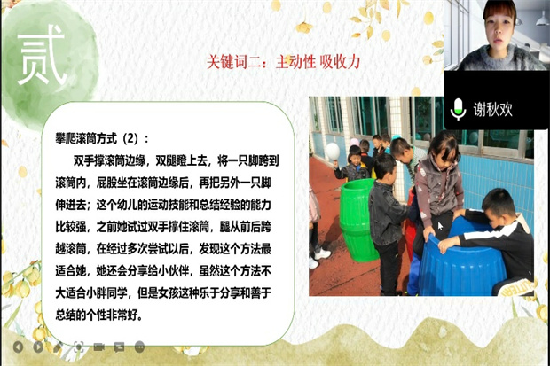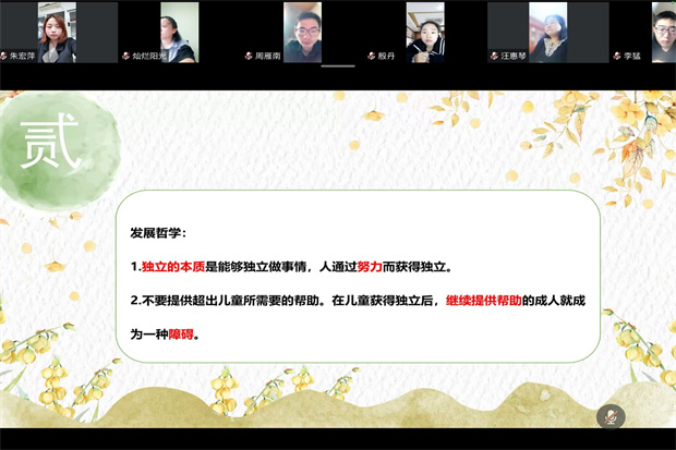 突如其来的疫情暂停了校园生活,但却无法阻挡老师们线上学习互动的热情。2021年11月5日上午,龙虎塘街道中心幼儿园观察解读工作室的成员们相约“云会议”,围绕蒙台梭利的著作《有吸收力的心理》第13至15章,开展了主题为“书以解惑,共论运动”的工作室活动。 读书分享篇:儿童发现世界 教师发现儿童 前期,每位教师都围绕话题结合实践梳理了框架内容,并通过群打卡的方式分享了自己的阅读感受。现场,由谢秋欢组长结合日常户外活动的观察及童心解读,以照片和视频的形式记录下“渴望行走的儿童”,和大家分享了15分钟的ppt读书感悟。在她娓娓道来的三个小故事中,我们可以深切体会到读懂幼儿心声、支持幼儿游戏、打造适宜环境的重要性。当儿童的运动潜能打开,你将发现了不起的儿童,我们更会在向儿童的学习中成长。 互动教研篇:运动成就意志 兴趣决定宽度 本次互动教研环节,每个人都在自我深度阅读的剖析中,进一步理解运动对儿童“吸收”的重要作用。大家以照片、案例的形式分享自己的实践经验。在深度互动的过程中逐渐明晰:渴望行走是一个过程,儿童享受过程,我们应通过观察,创设适宜的心理环境与物质环境。如何创设需要与幼儿对话互动、共同商量。儿童在这其中,到底是怎样去玩和成长,行走是否成功,幼儿真正获得了什么,也是我们需要不断探索的问题。总之,行走使孩子从不自由、需要帮助的状态中解脱出来,生活开始由他自已支配,是孩子的第二次生命,只有自主行走才能走向独立,从而拥有更多的认知机会和感知经验。 总结提升篇:理念对接实践 梳理系统经验 活动最后,书记员朱宏萍副主任进行总结提升。她表示:运动对于健全身体、心理发展等方面都有重要作用,不能孤立来看。儿童有自己的想法,我们应打造适宜的环境,支持幼儿的参与,通过分享交流、互动调整,促进儿童运动中的深度学习。吴紫阳副园长和季雪芬主任也表示:本次读书活动既有个人观点的重点分享,也有日常过程中的贴地思考;既看见了主持人的个人魅力,也看到了现场与会人员的思维活力。 停课不停研,龙幼人将继续用书香温润自己的心灵,继续踏实行走。让我们期待下一次活动现场再相聚。