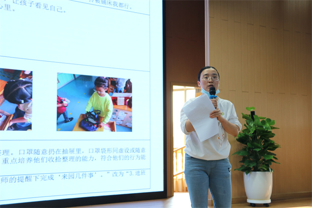 为进一步提升保育员教育理念,助推幼儿自理能力发展,5月16日下午,龙虎塘街道中心幼儿园四园区保育员做好个人防护的同时齐聚盘龙新园报告厅,开展幼儿自理能力培养专题交流会。 观看视频,感悟分享 活动伊始,全体保育员一起观看了视频《日本幼儿园幼儿自主用餐》,并围绕话题“请用关键词谈一谈你眼中的幼儿是什么样子的?视频中的哪些细节带给你某些触动?”进行现场互动。耐心等待、倾听尊重、用餐氛围、能力培养……保育员们围绕不同的关键词畅谈了自己的感后感。大家对于幼儿自理能力培养有了更深层的认识,同时更加意识到自己职责的重要性。 现场汇报,梳理总结 活动前期,四园区保育员以年段进行分组,提前讨论,精心准备。在本次交流会上,各年段共选派9名保育员进行现场汇报。他们结合自己的工作实际和团队智慧,围绕每月幼儿自理能力观察评价表,既进行了儿歌、故事、图谱等策略梳理,又对评分标准和能力达成度提出了调整建议。同时,四园区总务基于保育员代表的交流,汇报了各自园区工作推进的方法和后续优化的空间。 总结提升,明确要求 潘雯雯主任肯定了全体保育员能够在日常工作中对照每月关注点,有目标、有抓手地去培养幼儿自理能力,并带着大家学习了《幼儿园保育教育质量评估指标》中关于“生活照料”的要求。同时她指出:保育的样子,是孩子的生活技能在不断精进;是孩子的良好生活习惯在逐步养成;是孩子的健康生活方式在积聚厚淀。期待大家都能够立足“儿童立场、育人为本”的服务理念,通过思想的渗透,方法的传授,习惯的培养,帮助幼儿养成使其受益终身的生活能力! 理念引领,最后,高亚媛园长从“为什么做?如何做?做得如何?”三个方面,带领全体与会人员再次明确了我园关注每月幼儿自理能力培养的意义。同时,希望后勤条线能够“意识内化、加强宣传、提升专业、园家共育”,不断推进此项工作的优化落实。也希望全体保育员本着尊重、信任、放手的理念,用心陪伴幼儿的健康成长。 通过本次培训,让保育员更加明确了自己的职责,也对他们专业成长的道路提出了更高的要求。今后,我园将继续开展丰富多样的保育员学习培训活动,为进一步加强保育队伍建设而不懈努力。