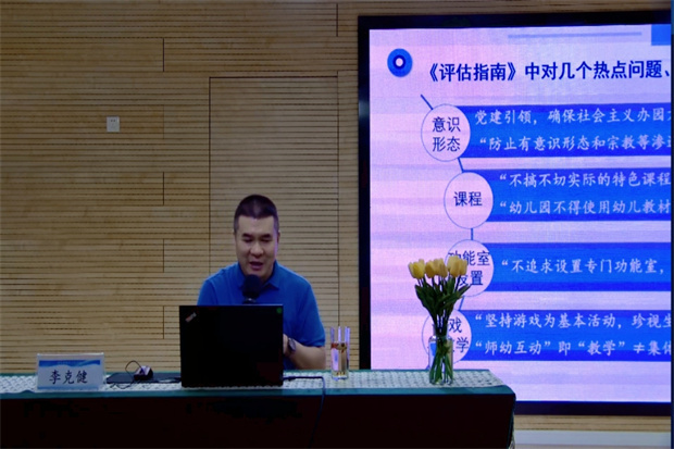 为深入贯彻《幼儿园保育教育质量评估指南》精神,树立正确的评估理念,切实提高幼儿园保教质量水平,8月8日下午,龙虎塘街道中心幼儿园全体教师“云”参与了《幼儿园保育教育质量评估指南》暑期学习研讨会。 浙江师范大学杭州幼儿师范学院、中国学前教育研究会评价专委会主任李克建教授带来了《〈幼儿园保育教育质量评估指南〉核心精神、主要内容与实践路径》专题讲座。李克建教授的讲座从《幼儿园保育教育质量评估指南》的背景与核心精神、幼儿园管理质量评估、保育教育过程质量评估、贯彻《幼儿园保育教育质量评估指南》的建议四个方面展开。李教授分别针对管理者及一线教师实践两个层面,对《评估指南》中保教过程评价指标进行了细致解读,帮助大家理清科学开展一日生活学习的思路,鼓励一线教师去发现日常事件中蕴含的教育价值,真正相信儿童是积极主动的有能力的学习者;鼓励教师“靠后站”,在观察记录、倾听理解、支持学习、提问回应等一系列的互动过程中实现有效教学。最后李克建教授为幼儿园教师保育教育实践提出建议,引领教师思考如何将这些理念与内容落实到日常工作的方方面面,更好地促进幼儿的全面发展。 常州市基教处孙静副处长就本次活动进行总结提升。她指出:《幼儿园保育教育质量评估指南》是我们教师走向专业的指挥棒,也是教师专业的隐形拐杖。各园要扎实地开展实践落实工作,切实地在实践中转变教育行为。教师要坚持儿童为本、过程导向、持续改进,成为幼儿成长之路上的支持者、引导者、合作者。 学习是一种收获,是一种乐趣,更是审视自身的一次机会。龙幼的教师们认真聆听,详细记录,书写自己的所感所悟。同时各级组组建“会议笔记QQ群”,每位教师将笔记上传群内相互学习翻阅,再次领悟内化。通过本次培训活动,教师对《幼儿园保育教育质量评估指南》有了更加清晰深刻的认识,同时也学习到了行之有效的科学方法,进一步明确了坚持正确方向、坚持儿童为本、坚持科学评估、坚持以评促建的基本原则,更好地理解和贯彻《评估指南》精神。 “知之而后信之,信之而后行之。”新学期,龙幼将以《幼儿园保育教育质量评估指南》为科学引领,通过各条线工作的融会贯通进一步深度内化讲座内容,在推进园本课程建设、提升保教质量的道路上奋发前行! 撰稿:江韦娟 照片:各园区教师 审核:张静 |