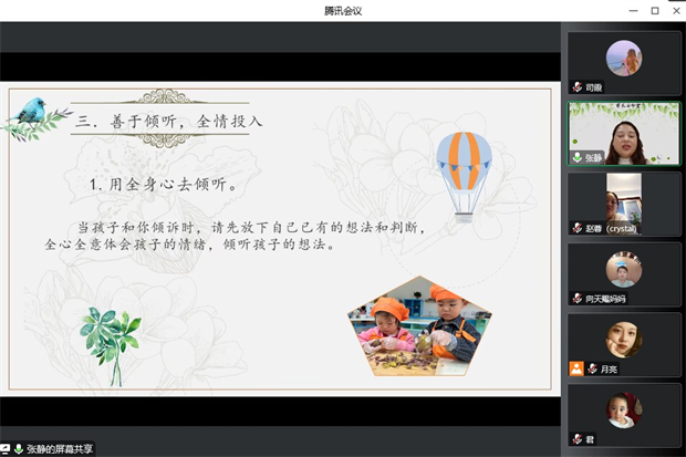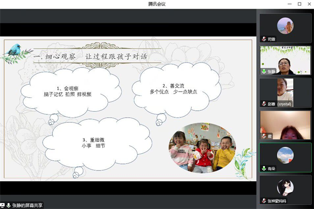家庭是塑造孩子健康人格的第一环境,如果说幼儿园教育是“阳光”,那么家庭教育则是那丰沃的“土壤”。为了让家长重视家庭教育的重要性,龙虎塘街道幼教集团开展了“家长云学堂”活动。本月围绕“智慧家长”主题,与家长携手,共探教育智慧,共“育”成长小美好! 前期准备,活动预热 根据小中大孩子的年段特点以及家长的不同需求,我们确定专场内容。通过海报预告的形式提前告知家长。家长朋友们也纷纷以QQ群接龙的方式火热报名。期待通过讲座,能够帮助家长朋友们形成科学的家庭教育观。 专题讲座,答疑解惑 活动分三场依次开展。小班专场,万燕、季金亚组长以《高效亲子沟通的技巧》为题,从细心观察,理性思考——情绪体验,感同身受——善于倾听,全情投入——清楚表达,有向引导四个方面,结合生动的案例,向家长们讲述了亲子沟通的小技巧,给了与会家长很多切实可行的建议。中班专场,王彩红副主任以《疾病预防,守护健康》为主题,主要以学龄儿童常见传染病、幼儿园日常卫生保健、园家共育小提醒三个内容为主线,通过对传染疾病的细致解读让家长们在保健方面予以重视,为孩子们的健康保驾护航。大班专场,张丽主任从孩子阅读的问题出发,分析原因,从阅读环境的打造、优秀绘本的筛选、阅读兴趣的激发给家长提出了很多小策略,期待通过园家携手,让孩子们真正的爱上阅读! 一路追光,一路同行 三场专题讲座,从不同的方面给了家长们全新的认知与可行的策略,家长朋友们们也在活动中收获满满,让我们听一听他们是怎么说的: 小班专场: 盘龙园区星星1班郑方志家长:和孩子保持身体距离,做个有耐心的听众,不要做一个情绪化的家长,学会跟孩子好好说话。 腾龙园区星星1班叶陈龙家长:要观察细微处,发现孩子的优缺点,和孩子多交流沟通,改正或夸奖,但不要以命令方式,家长也要反思自己。 中班专场: 玲珑园区月亮5班刘梦淇家长:对儿童常见病例有了更多的了解,掌握了一些健康管理知识,对做好病毒预防起到了重要作用。 盘龙新园月亮1班陈旭家长:了解了幼儿时期孩子会出现的一些疾病,会在今后的生活中更加去关注孩子的自身卫生和生活环境卫生,遇到类似的情况不会太慌忙,会去选择更优的处置方法。 大班专场: 盘龙新园太阳3班孙帆家长:这次讲座让我们意识到自己平时在亲子阅读方面的责任缺失:1.阅读时间太少;2.家长单方输出、没有能正确引导孩子在图画绘本中挖掘细节。 玲珑园区太阳2班徐皛家长:讲座内容丰富,生动具体,如何挑选适合孩子的绘本,和孩子阅读绘本的关注点,怎样才能激发孩子阅读的兴趣等,对家长培养孩子良好的阅读习惯有很大的帮助。 遇见,是故事的开始,同行,是温暖的篇章......相信园家携手必能为孩子们营造健康、和谐的成长环境,共促龙娃健康成长! 撰稿:武亚男 摄影:各园区教师 审核:张静 |
