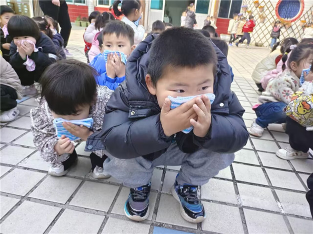 消防演练我能行 “呜~呜~呜~”,火灾警报声响彻整个幼儿园,听到危险信号,全体师幼立即停下所有活动,各安全岗责任人迅速到位,在各个楼层的拐角处进行疏散和指引。班级老师快速组织幼儿捂住口鼻,弯腰俯身,按照预定的疏散路线,快速、有序地从班级向安全地带撤离。