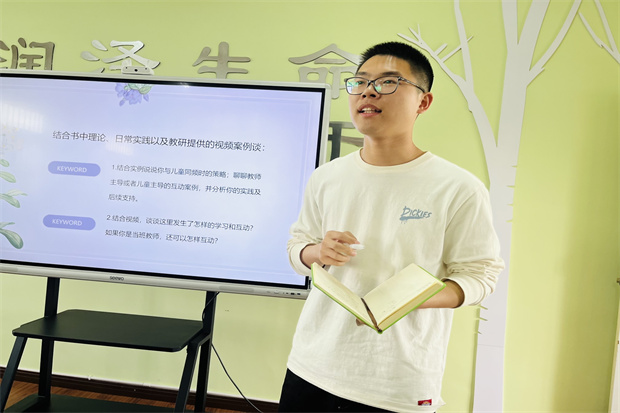 师幼互动的质量对儿童的发展有着重要的影响。4月17日下午,龙虎塘街道中心幼儿园全体教师围绕《互动还是干扰》一书进行深入的理论重温与实操探讨。期待能够以此帮助教师们结合日常、对接实践、理清思路。 观看视频、自主阅读:首先,各会场教师观看由各自园区童心解读种子教师提供的师幼互动的视频,围绕《互动还是干扰》一书中5-6章节的相关理论,现场在书签上写下自己的感悟并上传群里与大家共享。 围绕话题、分享交流:接着,大家结合书中理论、日常实践以及聚焦班本特色的视频进行有向研讨。我们主要围绕两个互动话题进行分组讨论,各组中心发言人踊跃发言,并和行政进行现场互动。在大家的头脑风暴下产生了许多值得学习的策略。 专业引领、总结提升:然后,由各园区相关课程研训中心行政进行现场提升总结,并对大家以后的工作提出希望。识别互动还是干扰是前提,牢记观察、记录、积极倾听、共同建构、对儿童着迷等策略,努力做到和幼儿同频。 问卷调查、追踪跟进:最后,各会场教师填写了关于师幼互动的问卷调查,旨在了解更多教师相关“师幼互动”的问题所在,以便后一步行动的再跟进。 今天的活动大家都受益匪浅,龙幼人将不断秉承润泽生命倾听花开的理念,将互动理论对接实践,在与幼儿互动的路上用心行走! 撰稿:司霞 照片:四园区教师 审核:张静