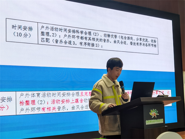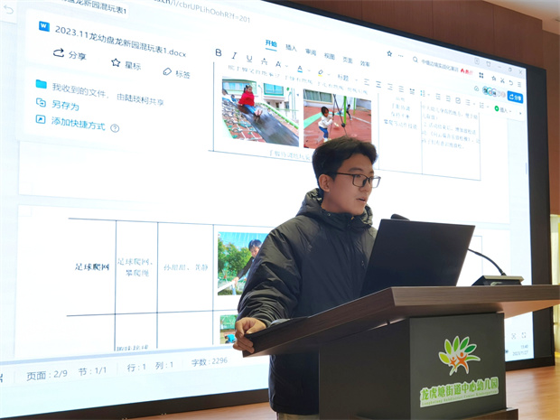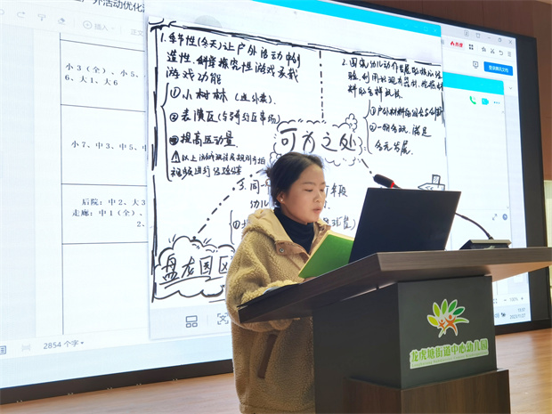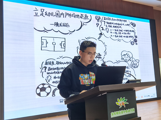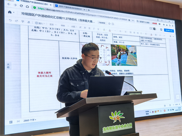 聚焦当下“户外运动质量提升”关注点,各园区基于户外场地资源进行园区个性化实施,在实践中聚力攻坚。2023年11月27日中午,龙虎塘街道中心幼儿园全体教师们相聚盘龙新园报告厅,期待在小口深挖井的沉浸式教研中解决户外活动中的真实问题,提升教师研究力。 集中反馈,明户外运动方向 活动伊始,季雪芬主任围绕盘龙新园户外活动项目研究,结合运动领域专家王彦老师建议进行反馈:前期在所有教职员工及四园区男教师1+N项目的推动下,新园的户外运动从游戏内容、形式、评价进行了优化调整。后续专家现场指出,老师们需明确理念,在过程中让孩子有更多运动的机会,提高运动能力。关注评价的价值导向,大循环的设置和灵活性,真正做到儿童视角,体现自主性。接着,项目组男教师代表周雁男老师解读“龙幼户外活动质量评价表”,以及2023优化版相关指标,从户外活动中增强幼儿运动能力,关注运动品质。最后,由课程条线项目负责人朱宏萍副主任跟进补充。她指出,希望老师们放慢节奏,倾听幼儿,创设孩子们喜欢的、更具有吸引力和挑战性的运动场地。 园区讨论,理户外运动行动 随后,全体教师按照园区分为四组,每组成员结合反馈建议及解读,立足园区内户外场地资源,谈后期的可为之处。教师们迅速聚集到场地,围绕着关注点以在线表格或海报呈现的方式互动研讨。讨论结束之后,各组1位中心发言人代表小组阐述观点。在研讨中,老师们结合幼儿游戏照片或关键词展开,有聚焦园区的资源盘点与运用;有结合场地的材料整合意见;还有结合不同年段的运动能力建议。教师们更加明确理念,在互动中达成共识,经验共享。 提升总结,追户外运动质量 最后,宋一叶副园长对活动进行总结提升。她先对近期户外运动质量的项目跟进,每个团队前期的准备和男教师团队的担当和付出给予充分肯定。期待在后续行动中持续跟进,关注三个关键点:聚焦户外运动,把握关键时期;支持运动游戏,满足运动需求;剖析运动价值,链接学习发展。还指出,幼儿运动能力的发展需要向两个方向去考虑,既要“向高处走”,更要“向宽处行”。户外运动的高质量,核心在于能否促进幼儿的身体与运动能力的高质量发展。通过有效的户外运动组织和实施,来促进幼儿体质体能的发展,更进一步激发幼儿运动的主动性、积极性,促进他们多元能力的综合发展。 幼儿的运动能力提升是一个需要持续坚持、循序渐进的过程,我们将继续用发现和欣赏的目光陪伴支持幼儿,在日复一日的生活中“探究、重复、试错”的过程共生共长。 撰稿:刘海英 摄影:肖欢 审核:张静