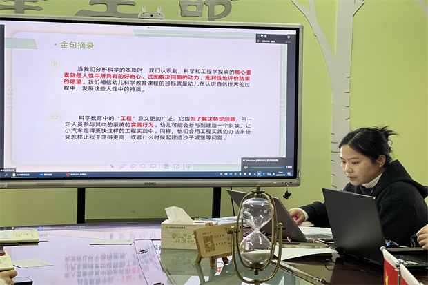 阅读是教师成长的必经之路,2024年2月19日,龙虎塘街道中心幼儿园全体教师分四园区开展了新学期《以游戏为中心的幼儿园课程》读书沙龙活动,在共读共研中实现共同成长。 专题分享:前期根据教师围绕《以游戏为中心的幼儿园课程》第9—12章节撰写读书笔记,现场四位教师代表围绕相关章节要点通过专题分享带领大家进行重温回顾,借助导图、金句及案例加深对相关章节的理解与认知,分享内容各有侧重、精彩纷呈。 读书沙龙:随后大家围绕话题展开深度思考,或阐述观点或互动对话,在交流探讨中更加精准地认识幼儿园课程中游戏的特点,更加清晰地反思新学期班级游戏的可为之处。 总结提升:最后,由各园区教学条线负责人在各会场进行总结提升。强调教师专业成长精于自我修炼,贵在日常坚持。鼓励每位教师要做好阅读计划,勤于学习反思,不断提升专业能力。 读专业书籍,品教育智慧。希望龙幼全体教师能品味书香,将所思所想所获运用到实践中,扎实日常行走。