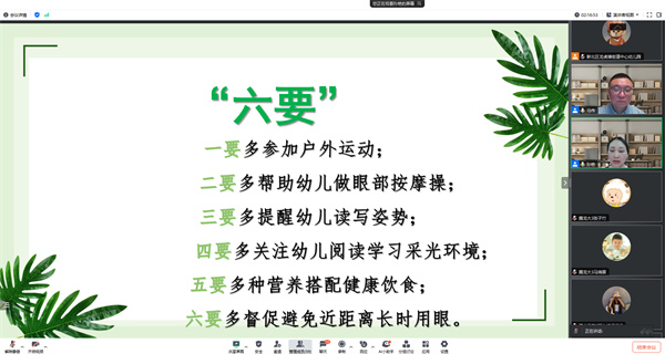2024年6月6日是第29个全国“爱眼日”,在全国“爱眼日”即将到来之际,为了让家长们能够更好地了解儿童用眼卫生及护理,2024年5月29日,特别邀请常州市第三人民医院冯伟主任面向腾龙园区家长开展了“儿童用眼卫生及护理”线上专题讲座。旨在帮助家长了解幼儿成长过程中对眼睛的科学防护,掌握科学用眼知识,以保护孩子的视力。 讲座中,冯主任利用PPT向大家介绍了眼睛的组成部分、近视的成因和科学用眼预防近视的知识。形象的图片,专业的讲解,让大家了解了眼睛的重要性,学习了正确的爱眼护眼方法。同时,从儿童常见病、儿童视力体检指标解读以及近视防控的六个要素三个方面进行了讲解。此外,向家长科普了儿童常见眼病,如结膜炎、麦粒肿、白瞳症等,并提供了预防和治疗的方法。最后,重点介绍了近视防控的六个要素,正确用眼、眼部按摩操、读写姿势、良好的用眼环境、加强户外活动和健康饮食。 活动结束后,家长们在会议留言栏中纷纷表示,通过此次讲座,大家对儿童用眼卫生及护理有了更全面的认识,能够正确引导孩子进行用眼保护。了解在日常生活如何用科学的方法预防儿童近视,以降低视力问题的发生率。此次活动不仅增强了家长对儿童用眼卫生及护理的认识和重视程度,还提高了家长对幼儿视力保护的能力,培养正确的用眼习惯。通过学校与家庭的共同合作,将形成良好的用眼环境,促进孩子视力健康发展。 撰稿:高燕红 摄影:范炳程 审核:张静 |