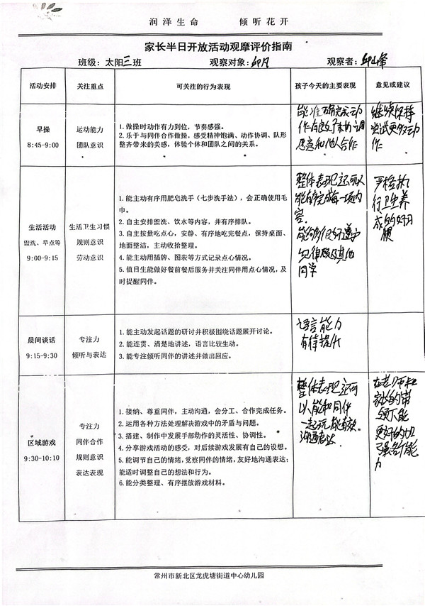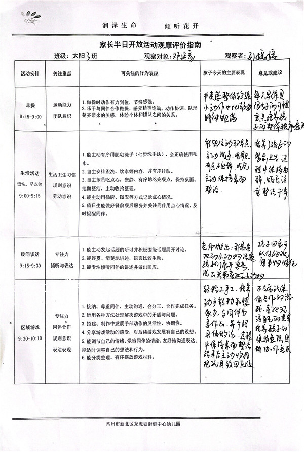 教育,是一场初见, 相遇,是美好的开始, 携手,是温暖的篇章, 陪伴,是最美的礼物。 为了更好地实现家园共育,促进幼儿健康成长,让家长朋友们更好地了解孩子们在幼儿园的生活学习情况,2024年10月31日至11月1日,龙虎塘街道中心幼儿园四园区大班年级组举行家长半日开放活动,邀请家长朋友走进幼儿园,以倾听者、观察者、参与者的身份沉浸其中,体验与孩子们在一起的美好时刻。 美好的一天,从充满活力的早操开始!在幼儿园里,一群可爱的小朋友们在老师们的带领下,认真地开展着早操活动,龙娃虎妞活力满满。家长们在观摩幼儿精气神十足的早操后,带着观察目标进入了区域游戏、亲子游戏或集体活动现场。在观摩过程中,家长选择合适的站位,对孩子们细致观察,不光看孩子的学习生活状况,也在考量老师的专业能力,更是对幼儿园半日活动的亲身体验。轻松有爱的氛围和良好的师幼互动都让家长们感受到成长的喜悦与教育的力量。 各班级老师根据孩子们的年龄特点和当下发展水平和家长朋友们开展现场互动。老师详细分享了开学以来在保育教育、规则意识培养和幼小衔接等方面所做的努力,并听取家长的意见和建议,以便更好地为每个孩子量身定制合适的教育方案。 最美的声音,是家园同频的回响。最好的教育,是家园共育的互动。匆匆半日,是爱的陪伴,也是心的沟通,家长们深刻感受到了教师的辛劳和对孩子们满满的爱,见证了孩子们成长的力量。 撰稿:王佳婕 摄影:四园区教师 审核:潘雯雯 |