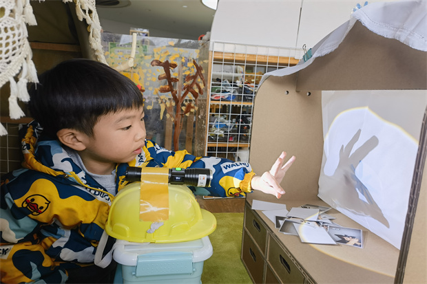影子是孩子们日常生活中经常能见到的自然现象,千变万化的影子深深吸引着他们。影子既能玩出许多有趣的游戏,又能为幼儿的科学探究提供无限可能。为进一步鼓励幼儿发现有趣的光影现象,本周,龙虎塘街道中心幼儿园四园区各中班年级组围绕光影开展了一系列主题性游戏。 光影绘梦,妙笔生花 在光影绘画的活动中,教师为幼儿创设了充满奇幻的光影绘画空间,准备好透明画纸与彩笔后,开启探索之旅。幼儿有的在纸上,有的在地上,有的在墙上,捕捉自然、物品、人物的影子。光影交织下,物体轮廓与光影变化瞬间呈现。孩子们仔细捕捉每一处微妙细节,用稚嫩笔触勾勒,将稍纵即逝的光影定格。在这一过程中,幼儿的观察力愈发敏锐,想象力自由驰骋,真切领略到光与影赋予绘画的独特奇妙魅力,创作出一幅幅童真与幻想的光影画作。 影之趣游,快乐嬉戏 活动区域内,影子的游戏也是乐趣无穷。“光影迷宫”神秘而诱人,镜子与灯光巧妙组合,构建出复杂多变、如梦幻般的光影路径;“瓶子里面有什么”借助手电筒探寻隐藏的秘密,通过细致观察,积极开动脑筋,幼儿匹配分类得津津有味;“影子变变变”探索不同物体在不同的光源方向会有不同的造型,星级挑战兴趣不断。在游戏中,幼儿不仅深入地感知和探索了光影的奇妙特性,对光影的认知也逐步提升,反应能力得到了有效锻炼。 光影剧场,童心演绎 除了绘画和游戏,光影剧场也热闹非凡。孩子们精心挑选喜爱的童话故事,或是发挥奇思妙想自编情节。表演时刻,幼儿借助幕布、人偶等道具,配合光影投射,呈现精彩剧情。期间,孩子们还需默契协作,有的专注调整光线强弱以营造不同氛围,有的用心把控光的方向来突出角色情感。活动不仅充分锻炼了幼儿的表现力,让他们在团队协作中学会沟通配合,更提升了对光影艺术的巧妙运用能力,开启了一段独特的艺术启蒙之旅。 在此次中班年级组的光影主题游戏,不仅为孩子们开启了光影艺术的大门,更在他们心中种下了好奇、合作与创造的种子。相信在未来的日子里,孩子们会带着这份对光影的热爱与探索精神,继续在成长的道路上绽放光芒。 撰稿:颜梦迪 摄影:四园区教师 审核:潘雯雯 |
